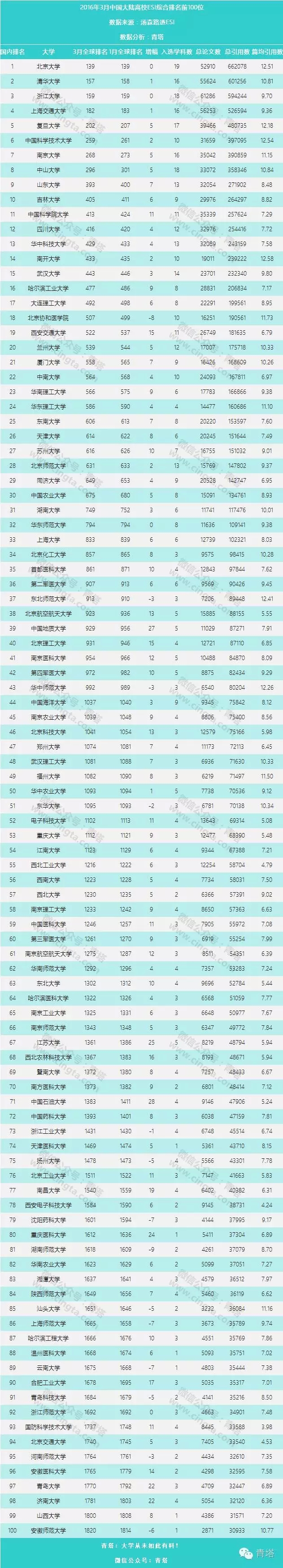 本期青塔统计了汤森路透公布的2016年3月ESI最新数据中国大陆高校前100名的情况,并与2016年1月进行了对比。综合来看,其中,各大高校大多有不同程度的进步,其中进步增幅最大的是中国石油大学,相比2016年1月进步了28位。此外,进步较大的高校还有中国地质大学、江苏大学、重庆医科大学、青岛大学、济南大学、南昌大学等高校。下面来看看各校ESI综合排名情况吧: