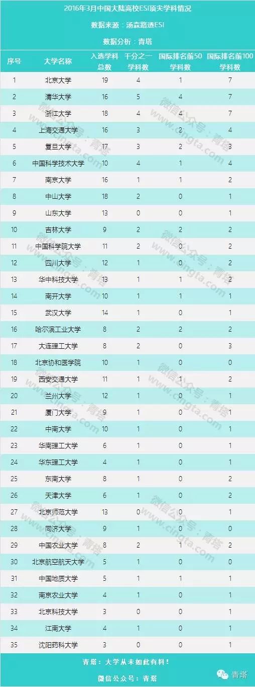 而一流大学和一流学科如何评价,ESI评价指标是个极其重要的参考依据。目前全球很多知名高校都在采用ESI来衡量和评价学科实力,国内各级教育主管部门和大学最近几年来也开始越来越重视ESI指标,越来越多的大学把进入ESI全球前1%的学科数量定为发展目标之一。本期青塔小编整理了2016年3月ESI最新数据中国高校综合排名前100名的情况,同时整理了各校入选的顶尖学科数以及国际排名情况,结果供大家参考。