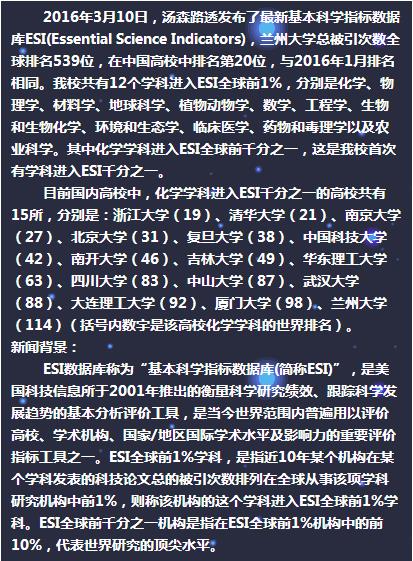 ESI发布最新数据 兰州大学化学学科进入前千分之一