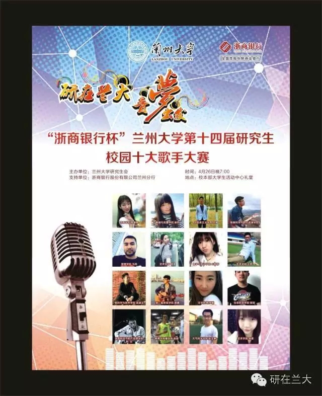 “浙商银行杯”兰州大学第十四届研究生校园十大歌手决赛——4月26日晚7点与您相约大学生活动中心礼堂。欢迎老师们和同学们届时凭校园卡等有效证件,提前15分钟入场观看。