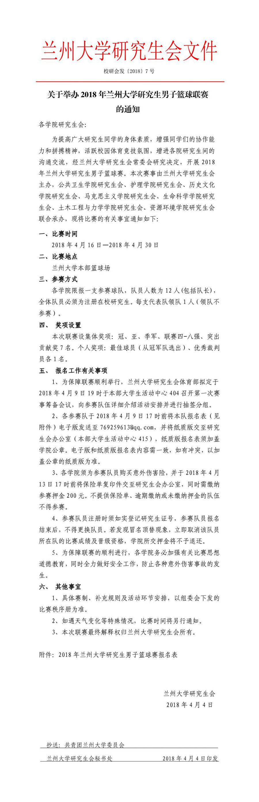 关于举办2018年兰州大学研究生男子篮球联赛的通知