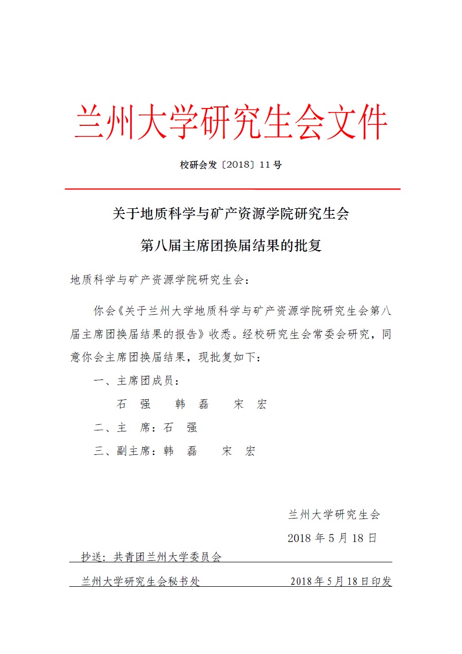 关于地质科学与矿产资源学院研究生会第八届主席团换届结果的批复