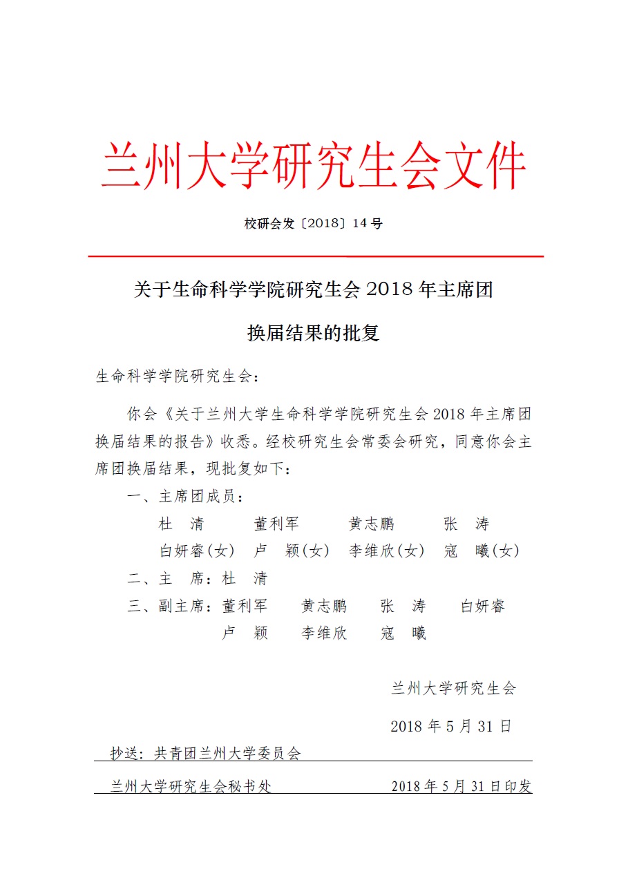 关于生命科学学院研究生会2018年主席团换届结果的批复