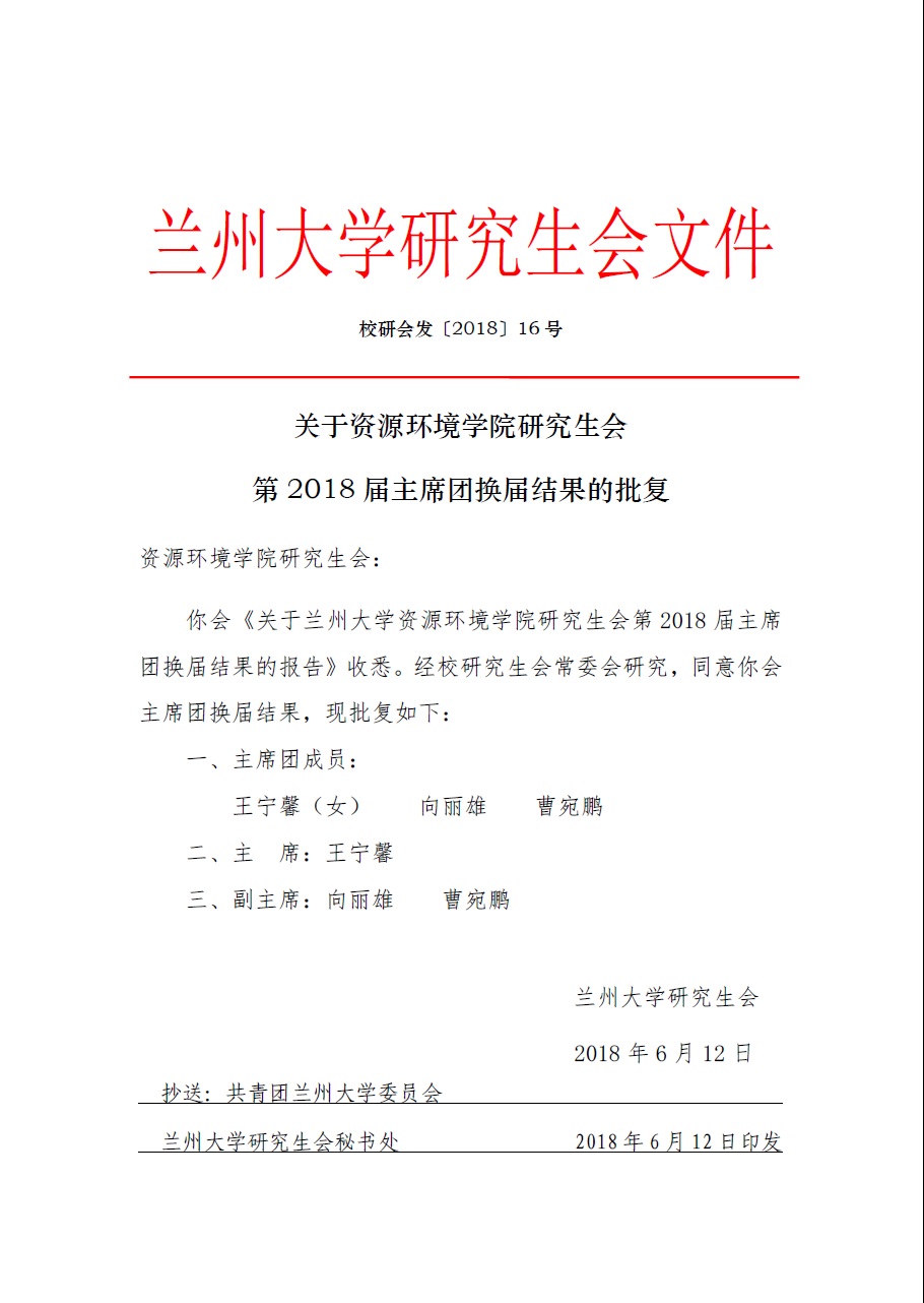 关于资源环境学院研究生会第2018届主席团换届结果的批复