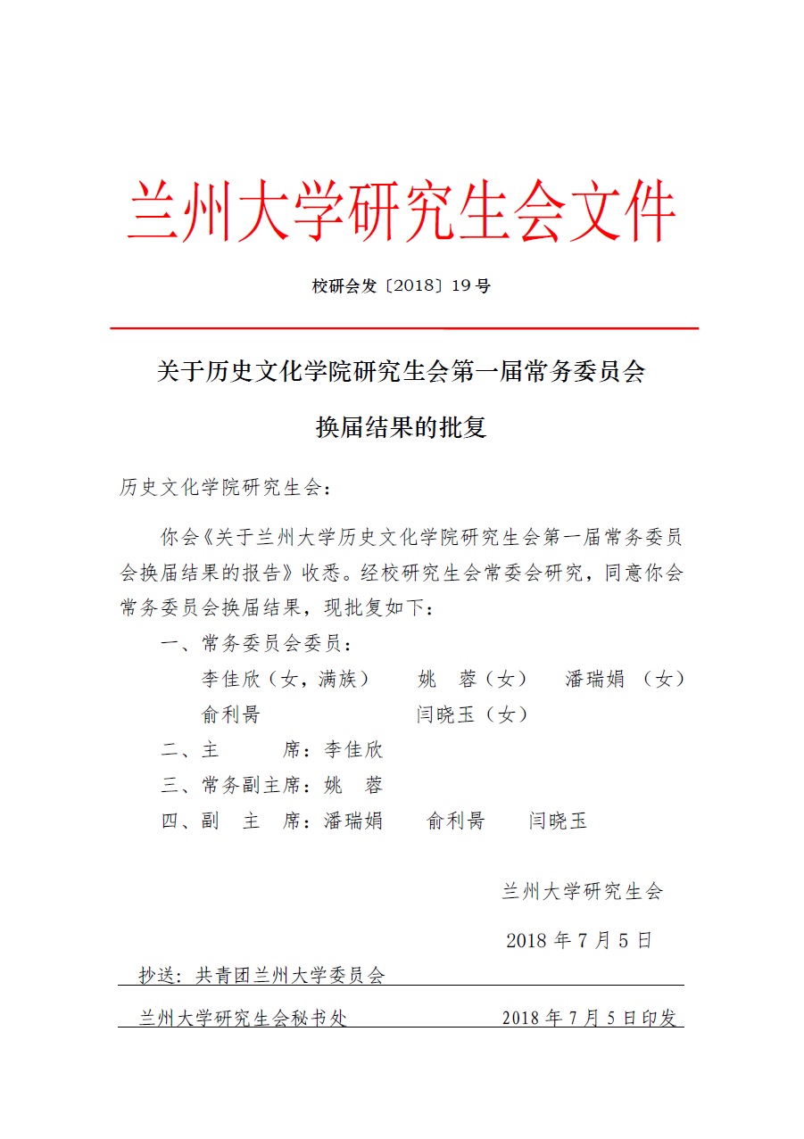 关于历史文化学院研究生会第一届常务委员会换届结果的批复